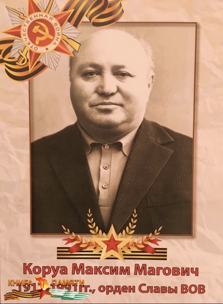 Максим Магович Коруа в годы Великой Оте-чественной войны отдавал все во имя Победы. Родина высоко оценила его ратный подвиг, награ-див орденом Отечественной войны I степени, медалями «За оборону Кавказа», «За победу над Германией», «За доблестный труд в Великой Отечественной войне» и многими юбилейными наградами.